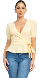 Quick view Peplum Wrap Top Fabric: 95% Polyester, 5% Spandex Size Available: S, M, L Color Available: Light Yellow P MSRP: Was: Now: $17.99 Options